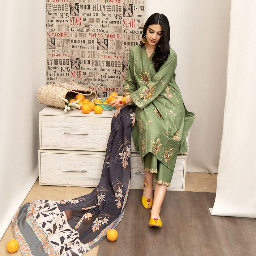 URGE-3PC LAWN EMB SHIRT WITH EMB TROUSER & DIGITAL PRINTED DUBATTA