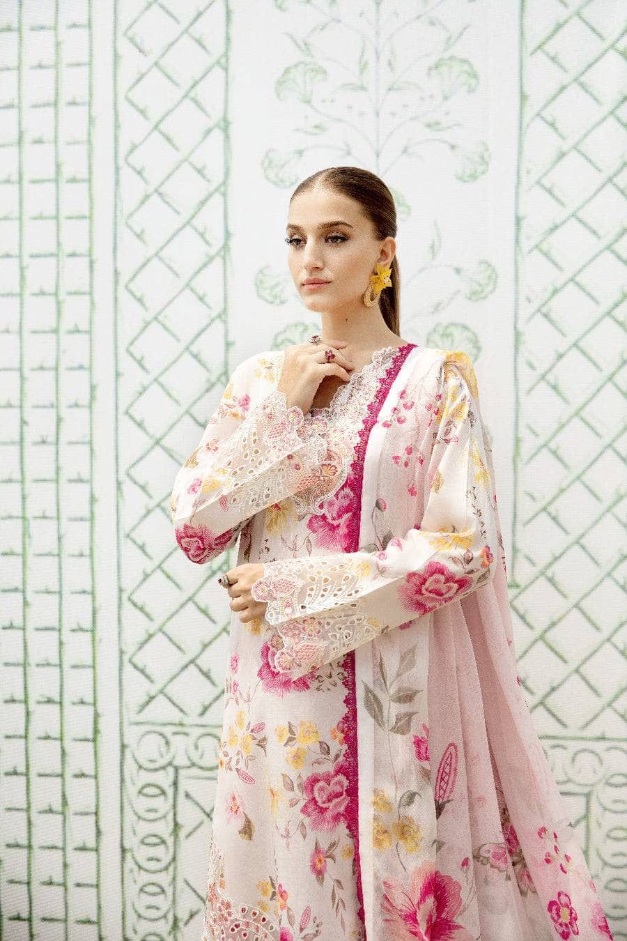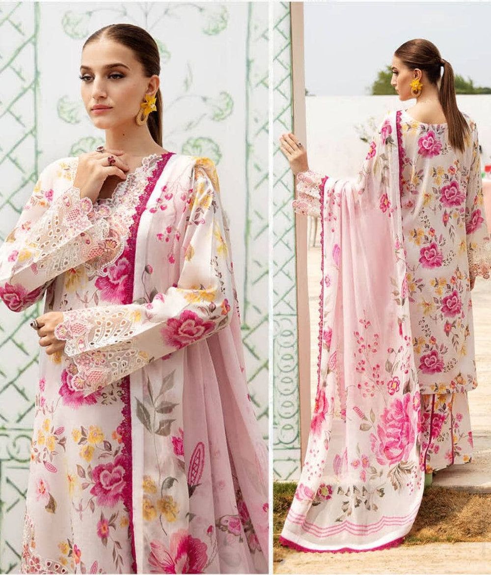 RAMSHA-3PC LAWN PRINTED SHIRT WITH PATCHES & PRINTED CHIFFON DUBATTA